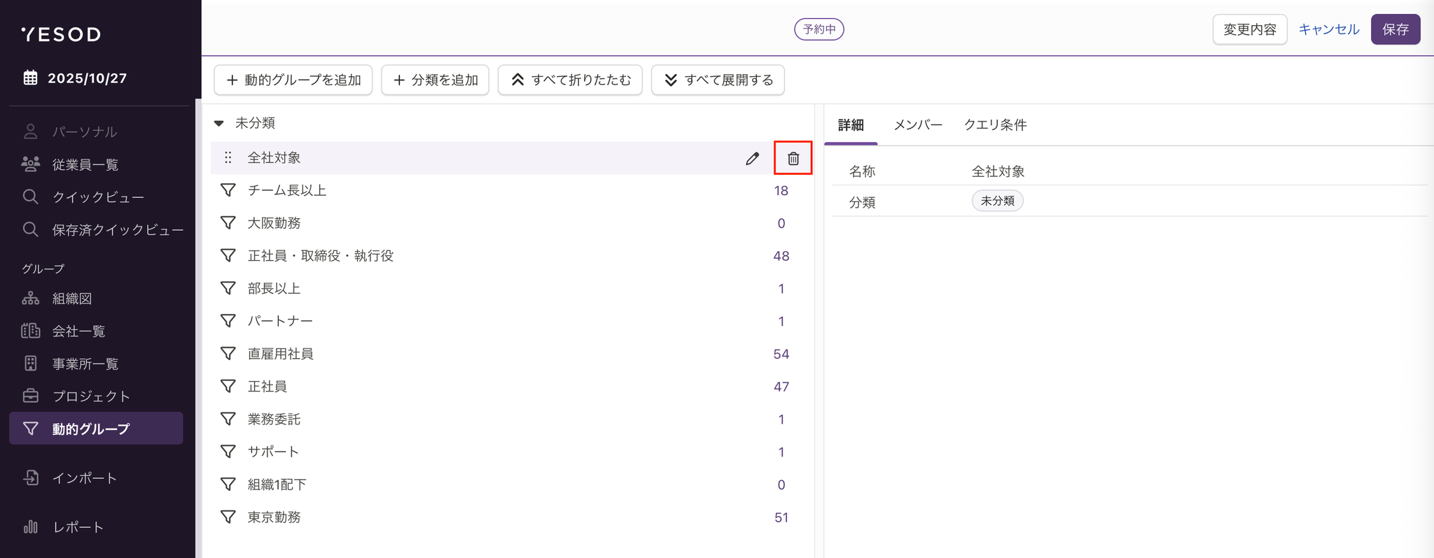 変更対象の動的グループにカーソルを合わせ、[ ゴミ箱 ]ボタンをクリック