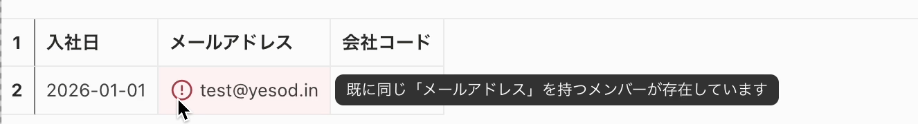 - 退職済みメンバーを再入社しようとする場合、セルのエラーとして画面では表示されます