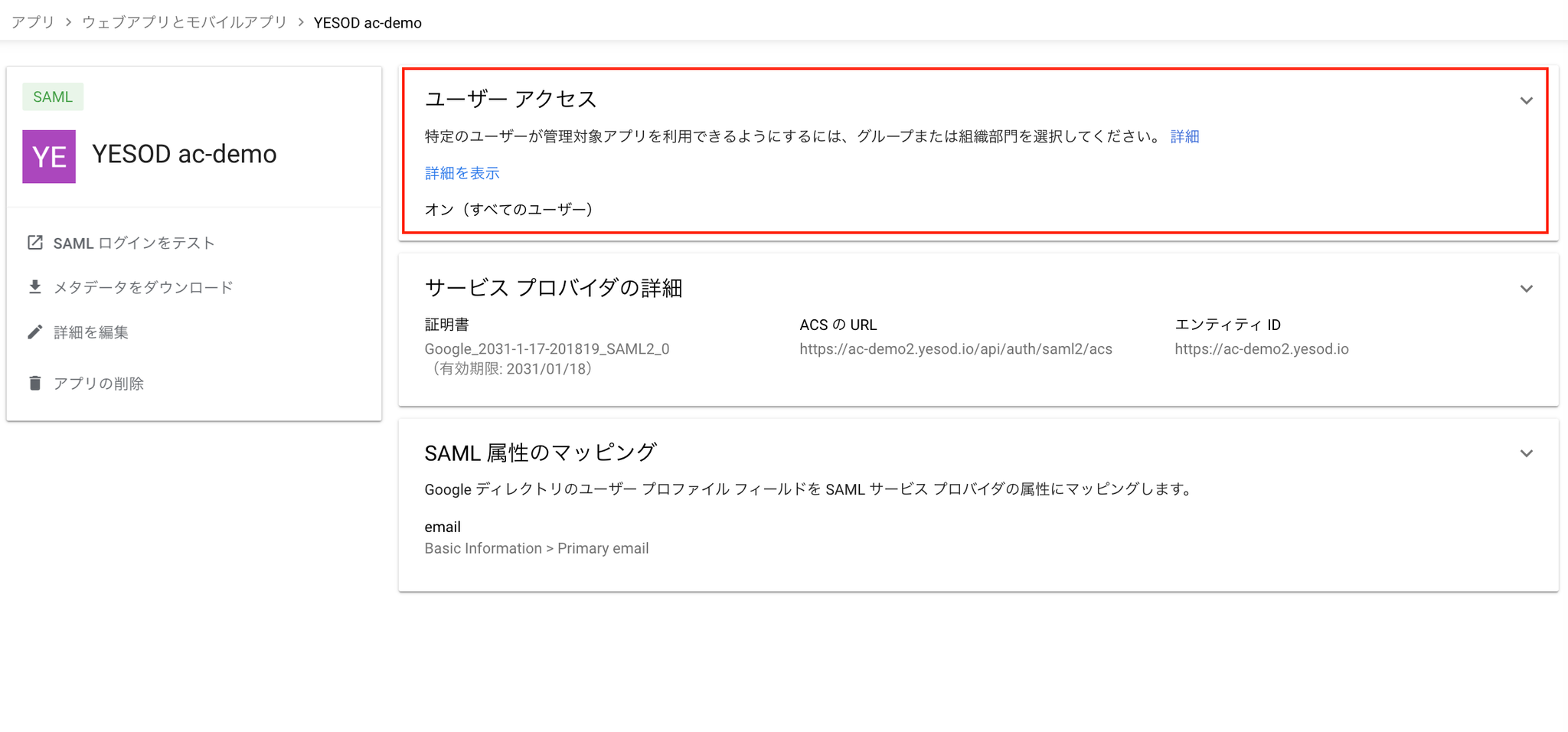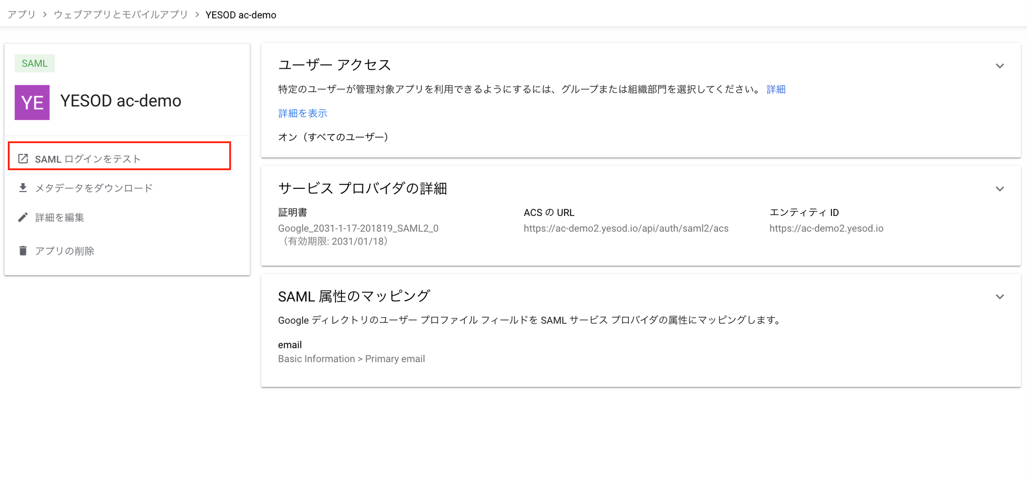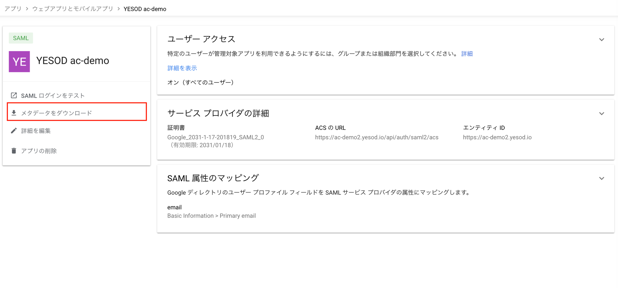 Google 側でSAML構成を行うために、以下の情報をYESODから取得します: