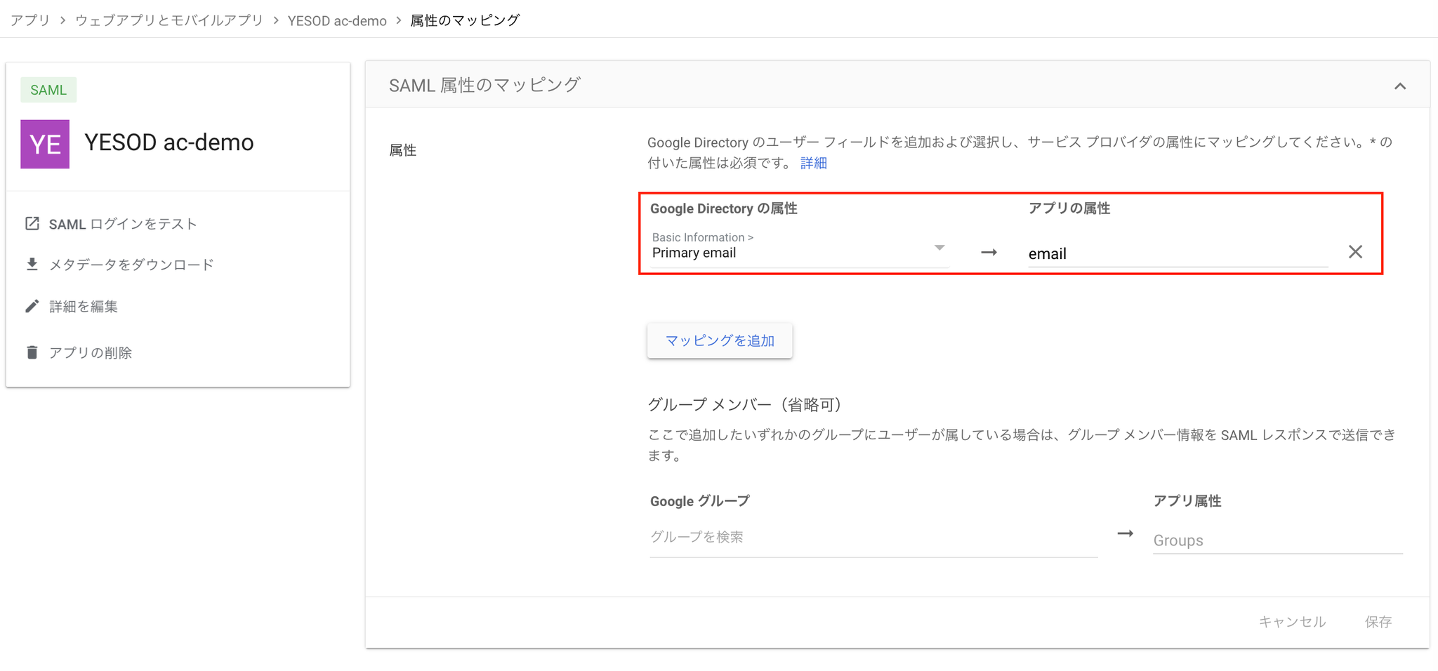 - 下記の通り、SAML 属性のマッピングの設定をしてください。