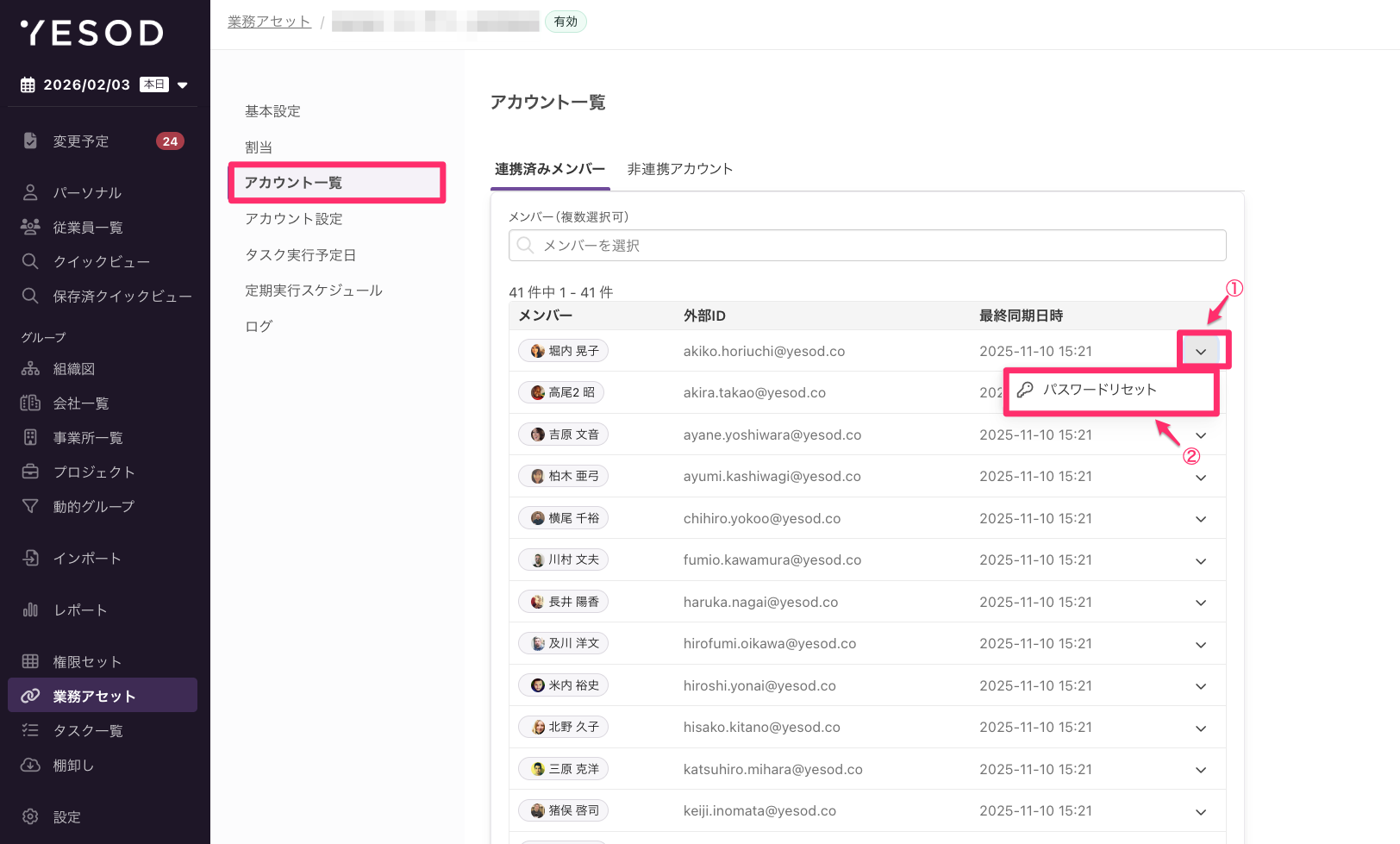 アカウント一覧画面からパスワードのリセットができるようになりました。本リリースにより各業務アセットごとのアカウント一覧画面上で、アカウントごとの行のアクションボタンからパスワードリセットを行うことができるようになります。