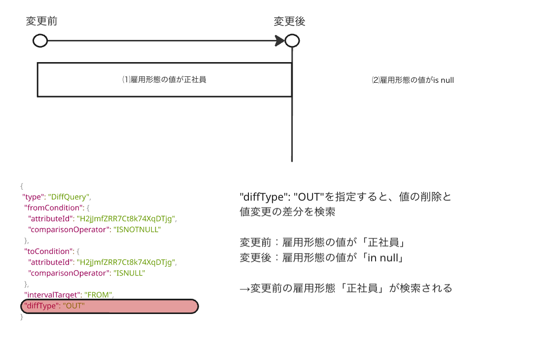 は、値の削除と値変更の差分を検索する際に指定します。退職など、削除を含む差分検索が必要な場合に利用します。