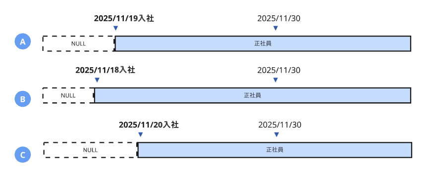 📊 【図解:11/19〜11/30 の入社者を抽出したい場合】