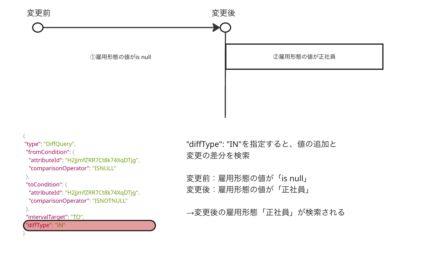 は、値の追加と変更の差分を検索する際に指定します。複数会社や組織の所属の追加を含む差分検索が必要な場合に利用します。