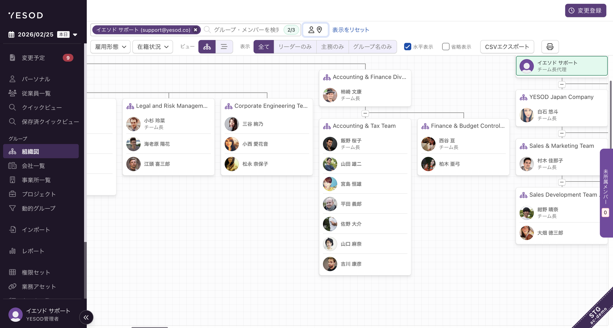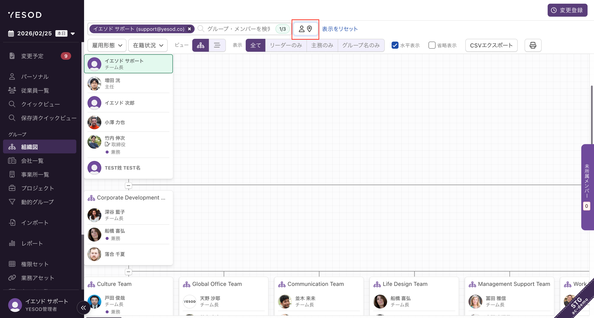グループ画面(組織図、会社一覧、事業所一覧、プロジェクト)で下記赤枠内のアイコンマークをクリックすると、自身の所属をハイライトしてジャンプします。