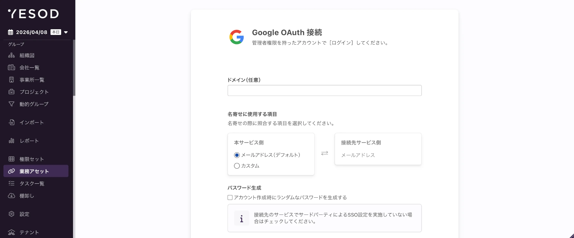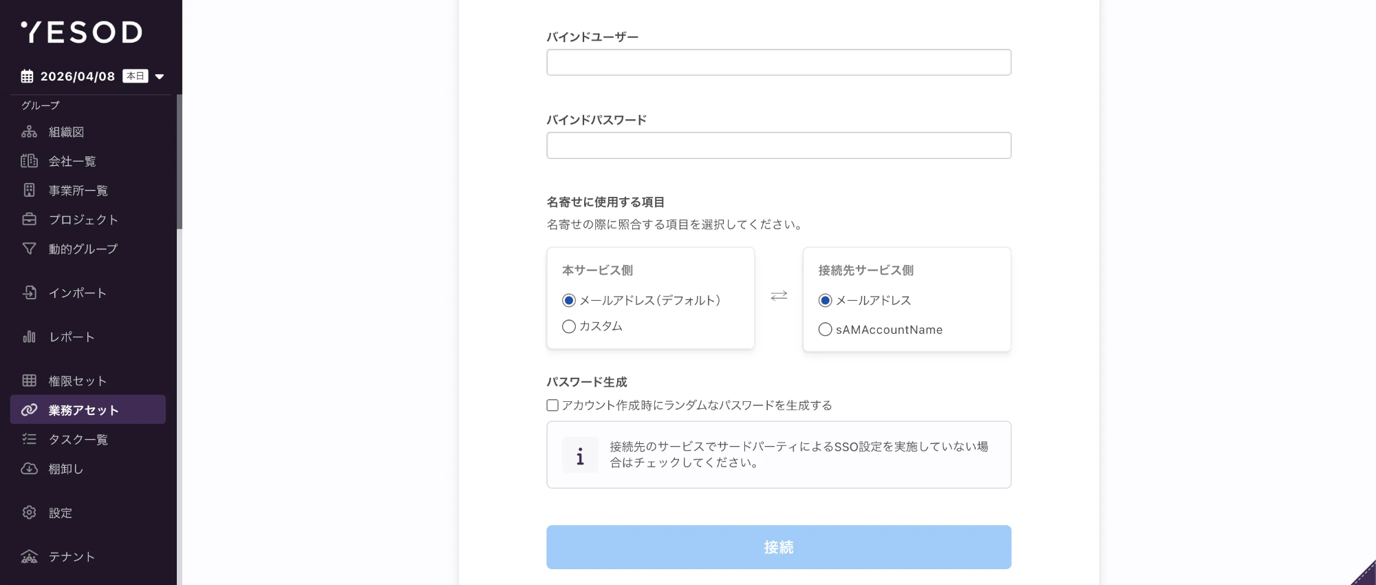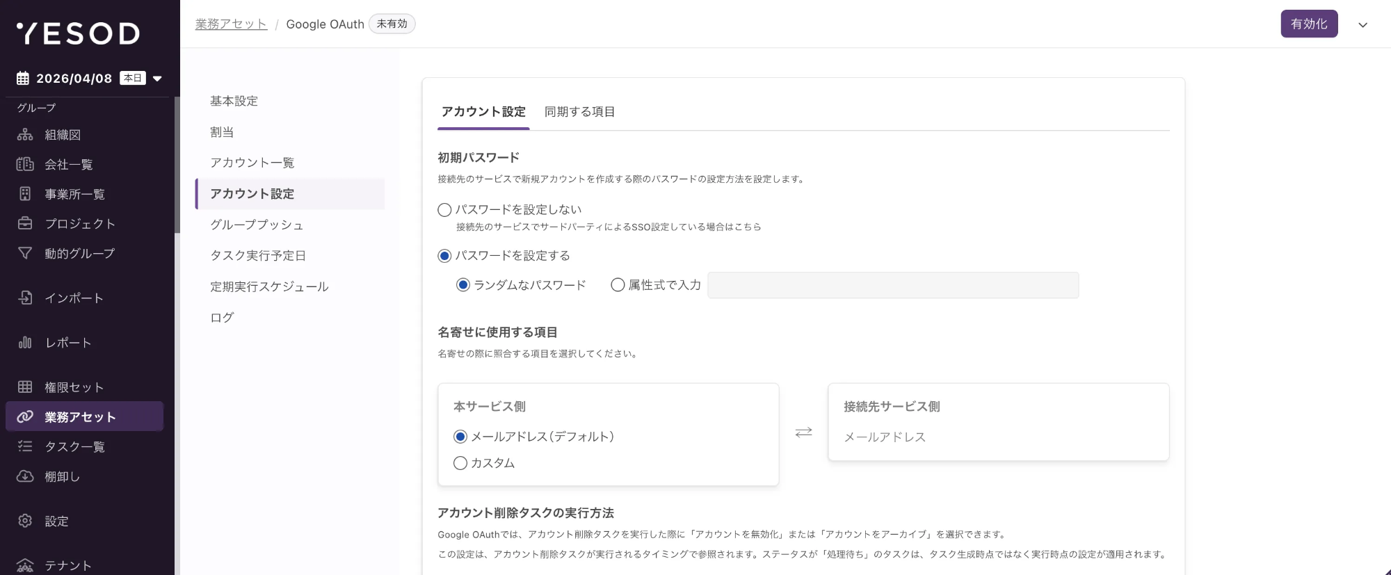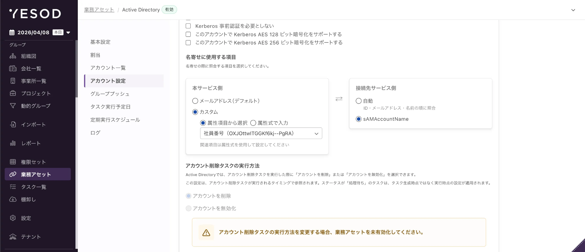ActiveDirectory 業務アセット作成後、アカウント設定画面に「名寄せキー」が表示されます。