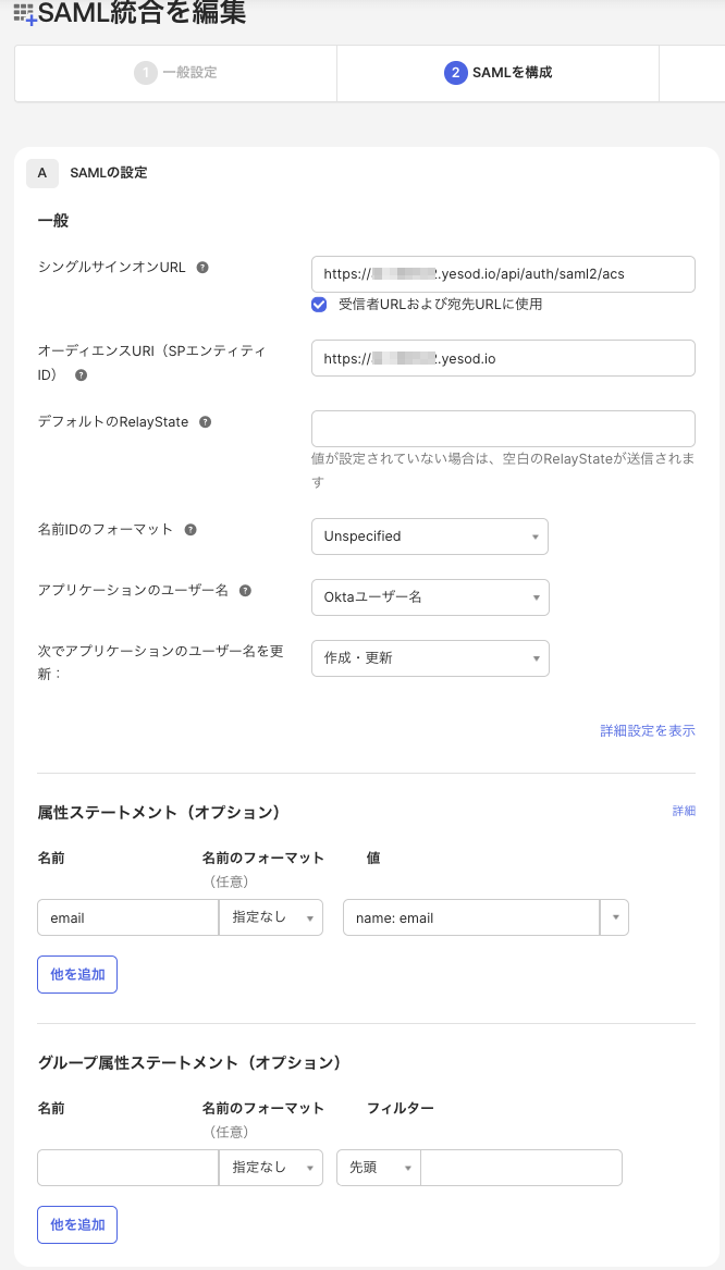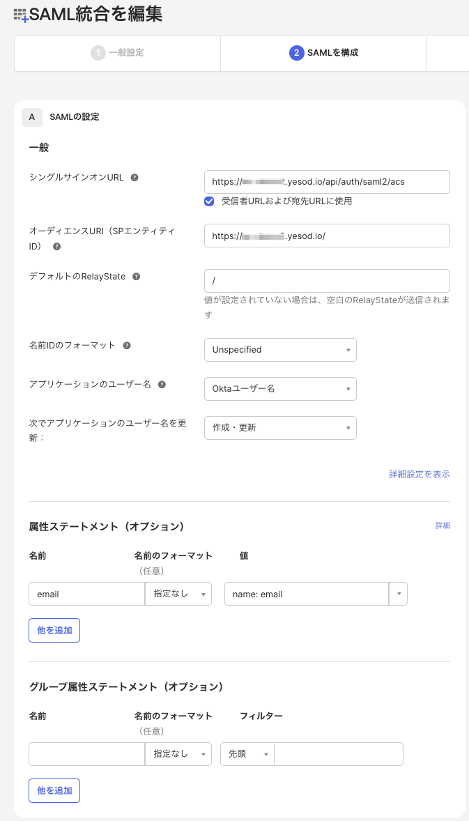 - OktaにてYESODにアクセスするための新規アプリケーション(SAML2.0)を作成してください