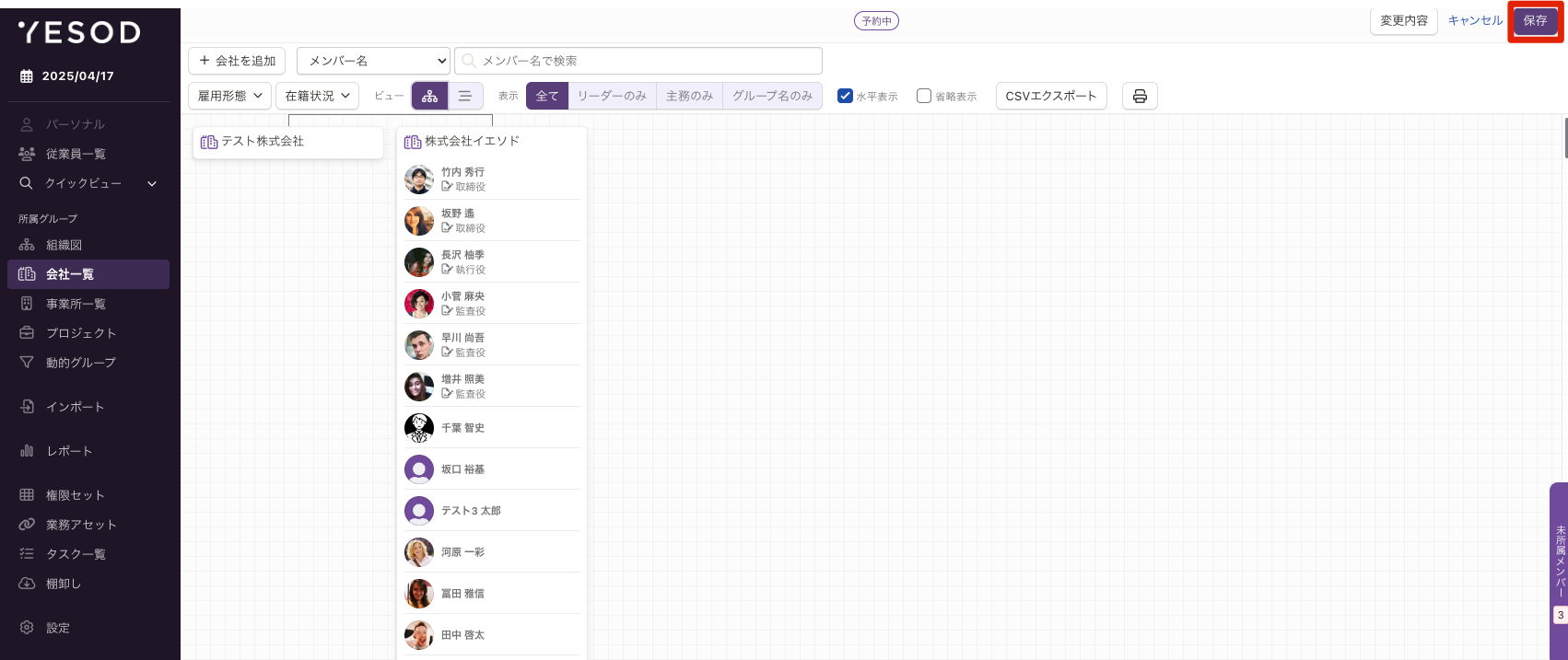 グループの一つに会社があります。会社一覧画面から登録します。YESODではメンバーの入退職の判定に使用されます。